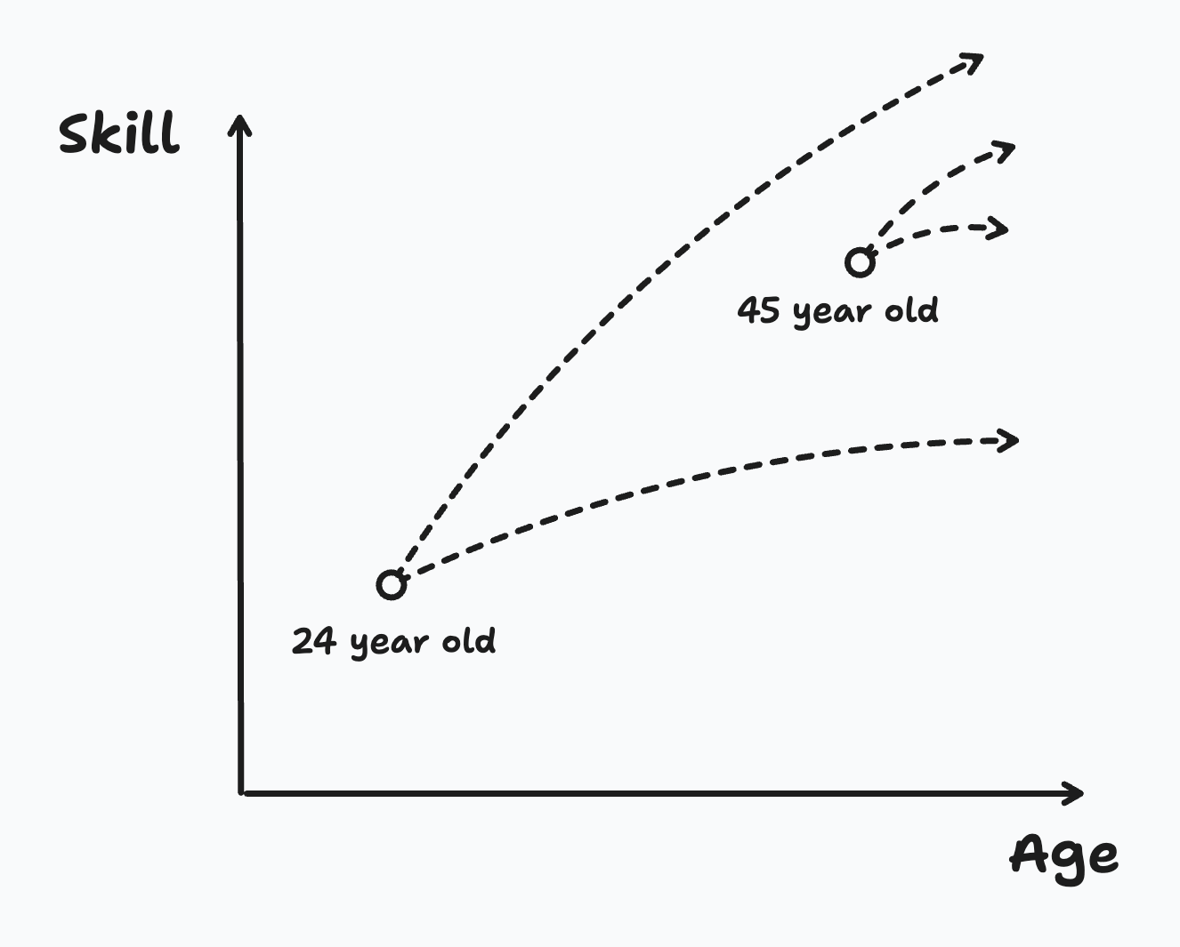 The age of thirty is somewhat arbitrary, but the point is that the older you get the more people will rely on past performance when evaluating you. For young people, there’s more variance in their future performance and often that upside is often mispriced.