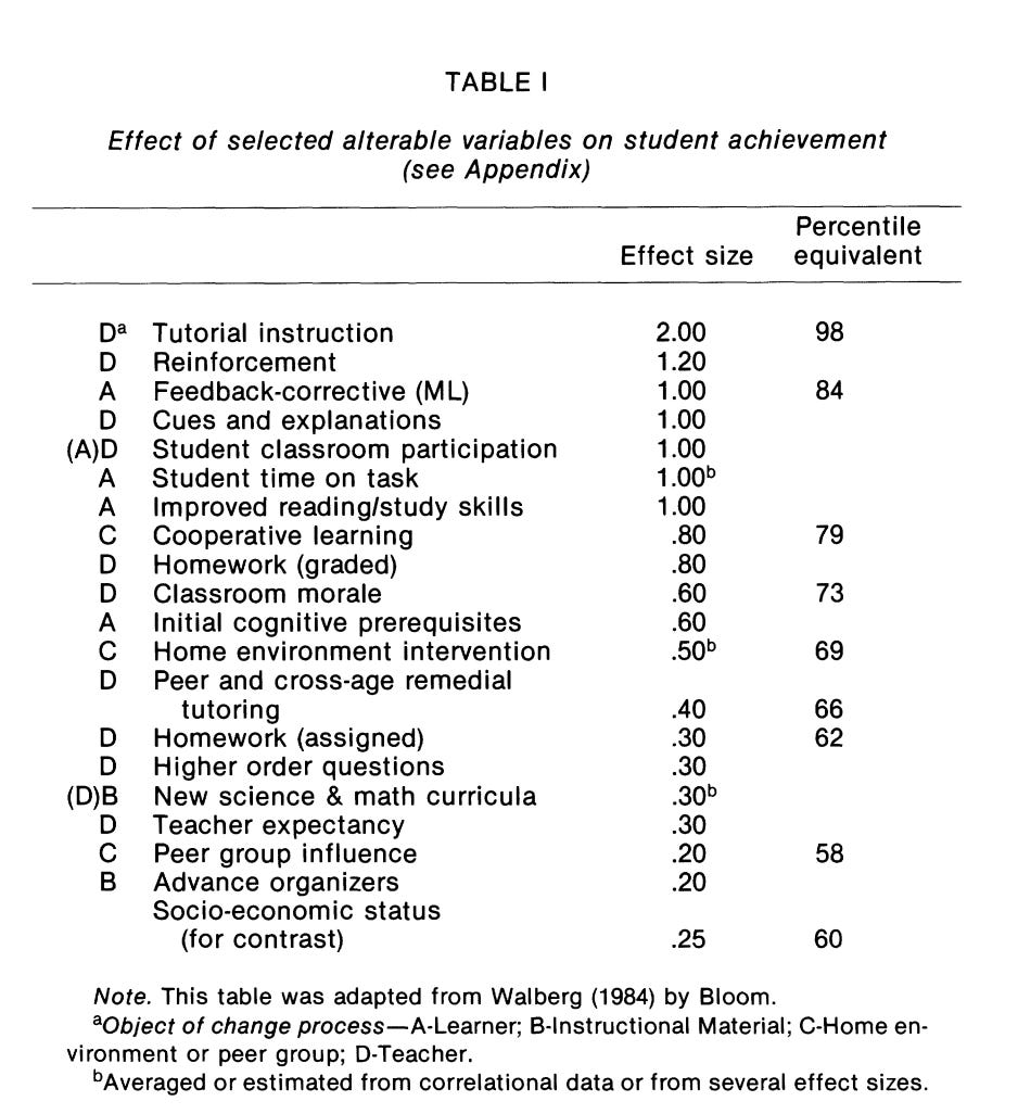 Bloom’s research tested the effects of different variables on student achievement. He found that “Tutorial enforcement” (aka tutoring) blows every other intervention out of the water. Specifically, tutoring has an effect size of 2 standard deviations above the mean while the second highest variable is only 1.2 standard deviations above the mean. No contest.